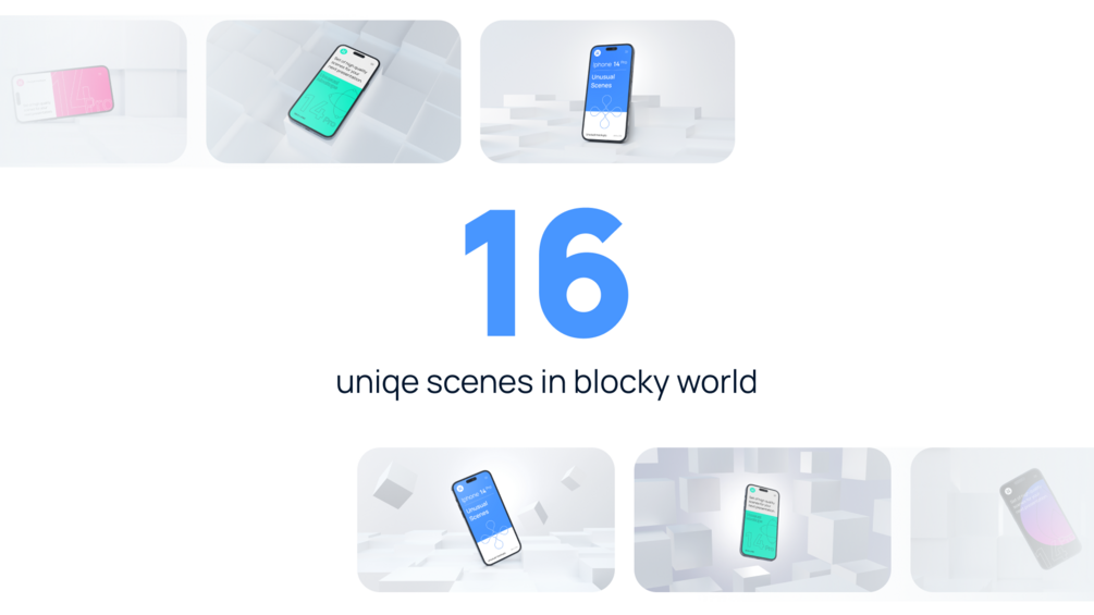 Introducing the Blocky iPhone 14 Pro Mockup Set by Unusual Mockups - the coolest way to showcase your digital creations! With 16 mind-blowing scenes of the futuristic iPhone 14 Pro, rendered in jaw-dropping 4K resolution, this mockup set takes your designs to another dimension.